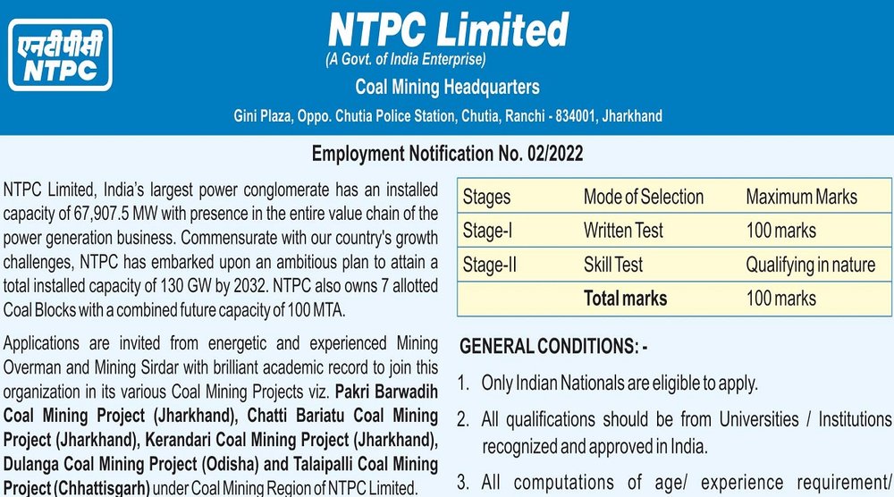NTPC Recruitment 2022: एनटीपीसी लिमिटेड माइनिंग सरदार और माइनिंग ओवरमैन के पद पर भर्ती के लिए उम्मीदवारों की भर्ती कर रहा है। इस भर्ती प्रक्रिया के माध्यम से कुल 177 रिक्त पदों पर भर्ती की जाएगी, जिसमें से 74 रिक्तियां माइनिंग ओवरमैन के लिए और 103 रिक्तियां माइनिंग सरदार के लिए हैं।