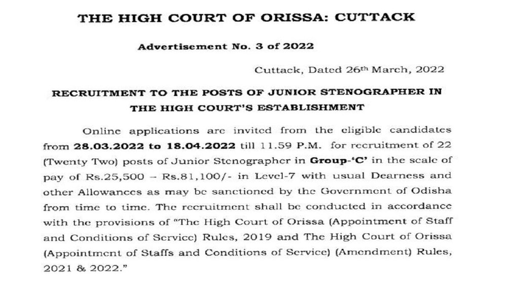High Court Recruitment 2022: ग्रेजुएशन पास कर सरकारी नौकरी की तलाश कर रहें युवाओं के लिए अच्छी खबर है। ओडिशा हाईकोर्ट ने जूनियर स्टेनोग्राफर के पदों पर भर्तियां निकाली हैं। इन पदों के लिए आवेदन की प्रक्रिया जारी है। अभ्यर्थी इन पदों के लिए आधिकारिक वेबसाइट orissahighcourt.nic.in के जरिए 18 अप्रैल 2022 तक आवेदन कर सकते हैं।