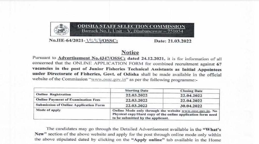 OSSC Recruitment 2022: ओडिशा कर्मचारी चयन आयोग ने जूनियर मत्स्य तकनीकी सहायक के पदों पर भर्तियां निकाली हैं। इन पदों के लिए आवेदन की प्रक्रिया जारी है। अभ्यर्थी आधिकारिक वेबसाइट ossc.gov.in के जरिए इन पदों के लिए 22 अप्रैल 2022 तक आवेदन कर सकते हैं।