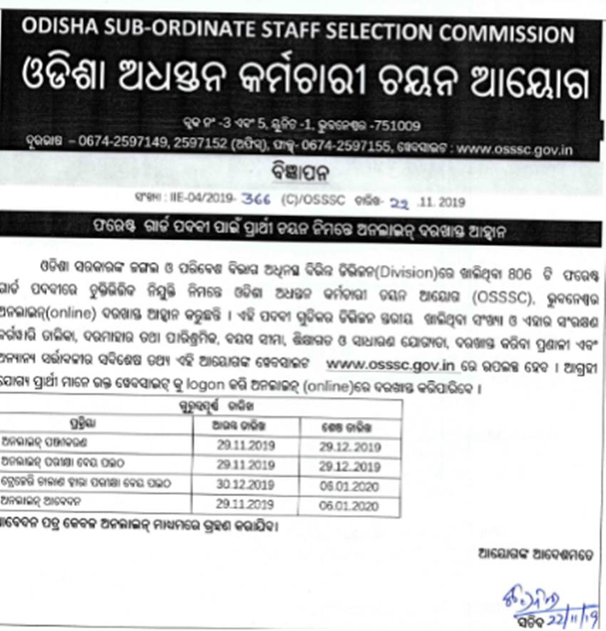 OSSSC Forest Guard Recruitment 2019 for 806 vacancies notification: ओडिशा अधीनस्थ कर्मचारी चयन आयोग (Odisha Subordinate Staff Selection Commission, OSSSC) ने वन रक्षक भर्ती (forest guard recruitment 2019) की भर्ती निकाली है। यहां कुल 806 पदों के लिए आवेदन मांगे गए हैं। इच्छुक और योग्य उम्मीदवार वन रक्षक रिक्तियों के लिए आवेदन के लिए ओएसएसएसी की आधिकारिक वेबसाइट http://www.osssc.gov.in पर विजिट कर सकते हैं। ऑनलाइन अप्लाई का लिंक आज यानी शुक्रवार, 29 नवंबर, 2019 को एक्टिव कर दिया गया है। वन रक्षक रिक्तियों के लिए पंजीकरण करने की अंतिम तिथि 29 दिसंबर, 2019 है। आइए जानते हैं ओएसएसएससी द्वारा निकाली फॉरेस्ट गार्ड भर्ती से संबंधित जरूरी जानकारी।