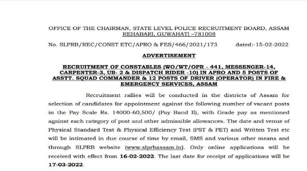 Police Bharti 2022: राज्य स्तरीय पुलिस भर्ती बोर्ड, असम (State Level Police Recruitment Board Assam) ने कांस्टेबल और ड्राइवर सहित विभिन्न पदों पर भर्तियां (Assam Police Recruitment 2022) निकाली हैं। इन पदों के लिए आवेदन की अंतिम तिथि 17 मार्च 2022 है. अभ्यर्थी आधिकारिक वेबसाइट slprbassam.in के जरिए इन पदों के लिए आवेदन कर सकते हैं।
