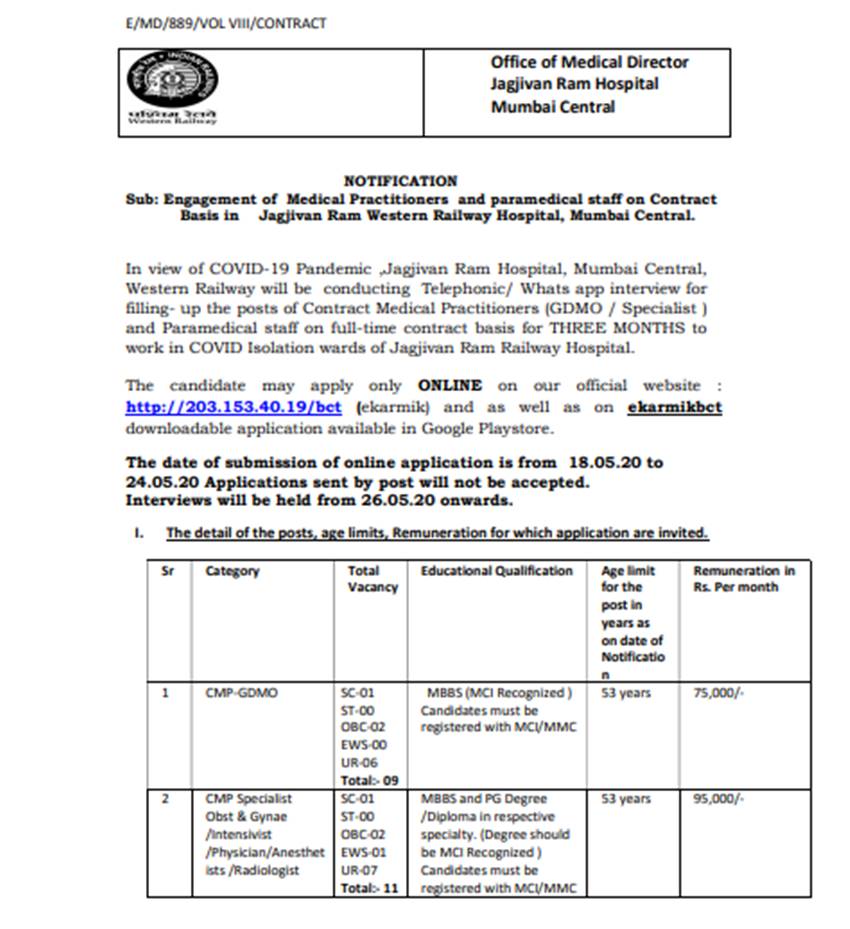 Western Railway Recruitment 2020: पश्चिमी रेलवे (Western Railway, WR) ने पैरामेडिकल स्टाफ और और कॉन्ट्रैक्ट मेडिकल प्रैक्टिशनर्स (GDMO / स्पेशलिस्ट) के पदों पर नौकरी के लिए आवेदन मांगे हैं। भर्ती में शामिल होने वाले उम्मीदवरों को लिखित टेस्ट नहीं देना होगा, सिर्फ इंटरव्यू के आधार पर चयन किया जाएगा। कॉन्ट्रैक्ट मेडिकल प्रैक्टिशनर्स पदों की भर्ती 3 महीने के कॉन्ट्रैक्ट पर होगी। इच्छुक और योग्य उम्मीदवार पश्चिमी रेलवे की आधिकारिक वेबसाइट wr.indianrailways.gov.in पर जाकर ऑनलाइन आवेदन कर सकते हैं। आवेदन की प्रक्रिया 18 मई 2020 से शुरू हो चुकी है, आवेदन 24 मई 2020 तक स्वीकार किए जाएंगे। यह भर्ती देश में फैले कोरोनावायरस COVID-19 महामारी को ध्यान में रखते हुए निकाली गई है। यह भर्ती अभियान जगजीवन राम रेलवे अस्पताल, मुंबई के आइसोलेशन वार्ड में कुल 177 खाली पदों की भर्ती के लिए चलाया गया है।