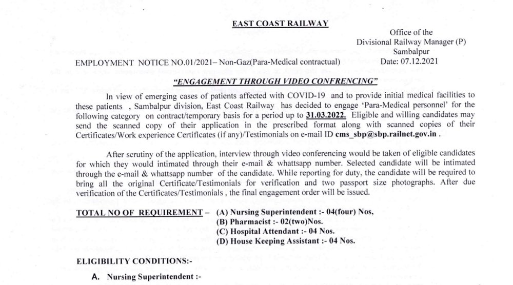 Railway Recruitment 2021: ईस्ट कोस्ट रेलवे (ECR) ने नर्सिंग सुपरीटेंडेंट, फार्मासिस्ट और अन्य पदों पर भर्ती के लिए एक नोटिफिकेशन जारी किया है। सभी इच्छुक और योग्य उम्मीदवार East Coast Railway Recruitment 2021 के लिए निर्धारित फॉर्मेट में अपना आवेदन मेल के माध्यम से 31 दिसंबर 2021 तक या उससे पहले भेज सकते हैं।
