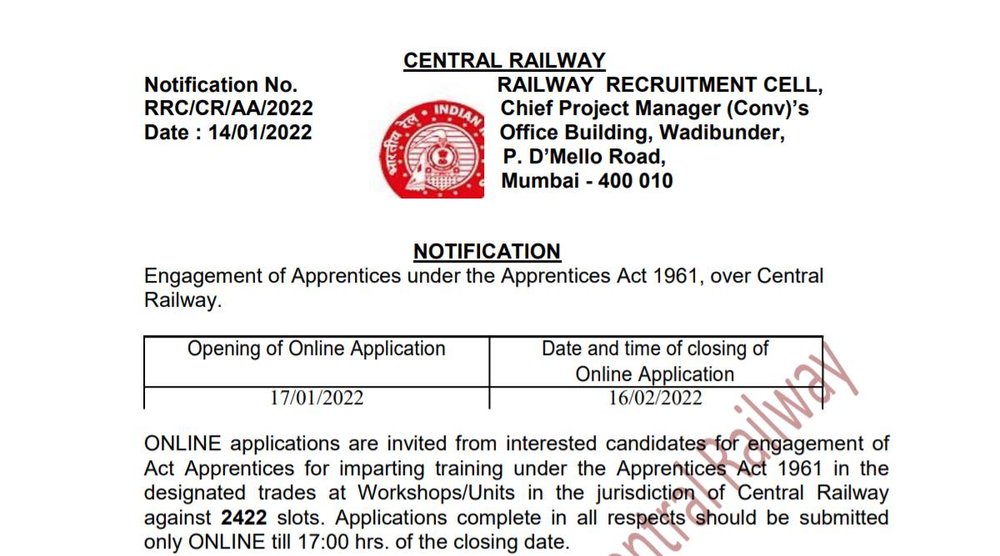 Railway Recruitment 2022: रेलवे रिक्रूटमेंट सेल, सेंट्रल रेलवे ने अप्रेंटिस एक्ट 1961 के तहत अप्रेंटिस के विभिन्न पदों पर भर्ती के लिए एक नोटिफिकेशन जारी किया है। सभी इच्छुक और योग्य उम्मीदवार Central Railway Recruitment 2022 के लिए आधिकारिक वेबसाइट rrccr.com पर 16 फरवरी 2022 तक ऑनलाइन आवेदन कर सकते हैं। इन पदों पर भर्ती के लिए आवेदन प्रक्रिया 17 जनवरी 2022 से शुरू की जा चुकी है।