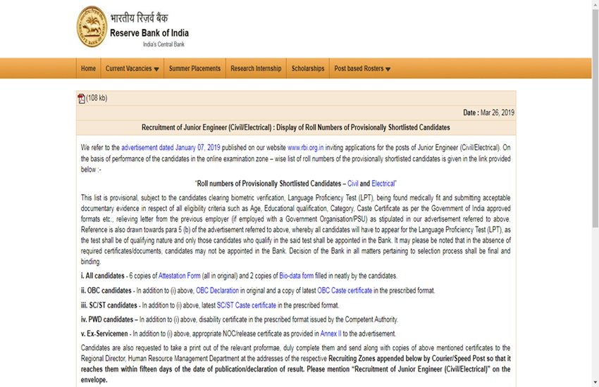 RBI JE Exam Result 2019: आरबीआई ने जूनियर इंजीनियर परीक्षा का परिणाम अपनी ऑफिशियल वेबसाइट पर जारी कर दिया है। वे उम्मीदवार जो इस परीक्षा में उपस्थित हुए हैं वे तुरंत आधिकारिक वेबसाइट पर जाकर अपना परीक्षा परिणाम जांच सकते हैं। रिजर्व बैंक ने यह परिणाम अपनी वेबसाइट पर 26 मार्च को जारी कर दिये हैं। आरबीआई ने जूनियर इंजीनियर भर्ती परीक्षा कुल 24 पदों के लिए फरवरी 2019 में आयोजित की थी। इस परीक्षा के परिणाम अब उम्मीदवारों के लिए ऑफिशियल वेबसाइट पर उपलब्ध हैं।