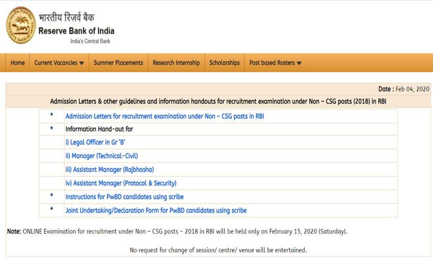 RBI Non CSG Recruitment Admit Card 2020: भारतीय रिजर्व बैंक (Reserve Bank of India, RBI) ने नॉन-सीएसजी (RBI Non-CSG) के विभिन्न पदों पर भर्ती परीक्षा 2020 के लिए एडमिट कार्ड जारी कर दिए हैं। जिन उम्मीदवारों ने इस भर्ती के लिए आवेदन किया था, वे अब आरबीआई की आधिकारिक वेबसाइट https://ibpsonline.ibps.in पर जाकर अपना एडमिट कार्ड डाउनलोड कर सकते हैं। यहां कुल 17 पदों पर भर्ती होनी है, जिनमें 1 लीगल ऑफिसर, 2 टेक्निकल मैनेजर, 8 असिस्टेंट मैनेजर (राजभाषा), 5 असिस्टेंट मैनेजर (प्रोटोकोल और सिक्यॉरिटी), 1 असिस्टेंट लाइब्रेरियन के पद शामिल हैं। इन पदों पर भर्ती परीक्षा 15 फरवरी 2020 को आयोजित की जाएगी।