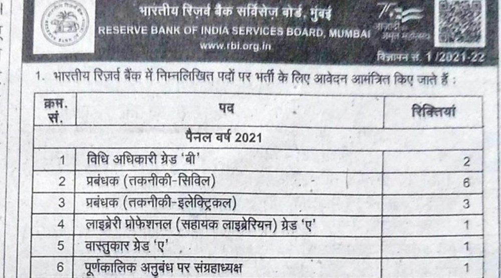आधिकारिक सूचना के अनुसार, रिजर्व बैंक ऑफ इंडिया में स्पेशलिस्ट ऑफिसर के कुल 14 रिक्त पदों पर भर्ती की जाएगी। जिसमें, लॉ ऑफिसर ग्रेड बी के 2 पद, मैनेजर (टेक्निकल-सिविल) के 6 पद, मैनेजर (टेक्निकल-इलेक्ट्रिकल) के 3 पद, लाइब्रेरी प्रोफेशनल (असिस्टेंट लाइब्रेरियन) ग्रेड ए के 1 पद, आर्किटेक्ट ग्रेड ए के 1 पद और फुल टाइम क्यूरेटर के 1 पद पर भर्ती की जाएगी। अधिक जानकारी के लिए उम्मीदवार यहां और बैंक की आधिकारिक वेबसाइट पर चेक करते रहें।