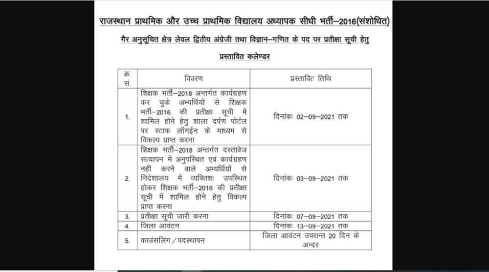 राज्य के शिक्षा मंत्री गोविंद सिंह डोटासरा ने ट्वीट करके बताया कि शिक्षक भर्ती 2016 में नॉन टीसपी में लेवल द्वितीय अंग्रेज़ी विषय के 511 रिक्तियों तथा विज्ञान-गणित विषय के 874 रिक्त पदों पर वेटिंग लिस्ट जारी करने का फैसला लिया है।