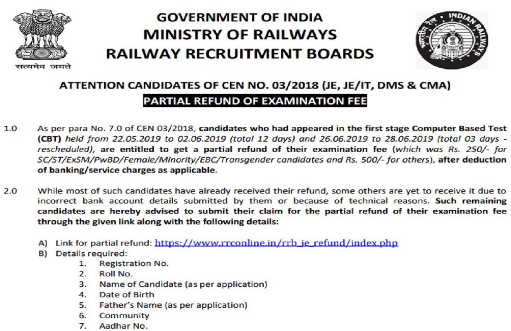 आरआरबी द्वारा जारी अधिसूचना के अनुसार सीईएन 03/2018 के पैरा नंबर 7.0 के अनुसार, उम्मीदवार जो 22.05.2019 से 02.06.2019 (कुल 12 दिन) और 26.06.2019 से 28.06.2019 तक आयोजित प्रथम चरण कंप्यूटर आधारित टेस्ट (सीबीटी) में उपस्थित हुए थे (कुल 03 दिन – पुनर्निर्धारित), अपने परीक्षा शुल्क का आंशिक धनवापसी प्राप्त करने के हकदार हैं (जो कि एससी / एसटी / पूर्वएसएम / पीडब्ल्यूबीडी / महिला / अल्पसंख्यक / ईबीसी / ट्रांसजेंडर उम्मीदवारों के लिए 250 / – रुपये और अन्य के लिए 500 / – रुपये था। ), बैंकिंग / सेवा शुल्क में कटौती के बाद,वापस किया जाएगा,”