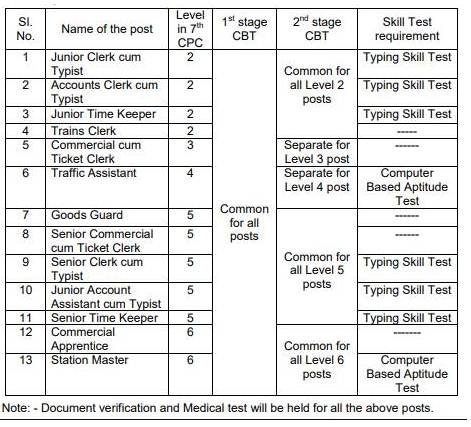 क्लर्क, कमर्शियल कम टिकट क्लर्क, गुड्स गार्ड, सीनियर कमर्शियल कम टिकट क्लर्क, कमर्शियल अपरेंटिस के लिए डॉक्यूमेंट वेरिफिकेशन और मेडिकल जांच के बाद दो चरण CBT होंगे। दूसरी सीबीटी के लिए उम्मीदवारों की शॉर्टलिस्टिंग पहली वाली सीबीटी में योग्यता के आधार पर किया जाएगा। दूसरी सीबीटी में पास होने के बाद उम्मीदवारों को स्किल टेस्ट देना होगा।