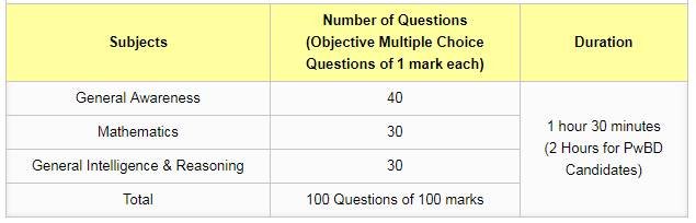 अवेयरनेस से 40 नंबर के सवाल आएंगे। जनरल इंटेलिजेंस और रीजनिंग से 30 नंबर के सवाल होंगे। गणित से 30 नंबर के सवाल आएंगे। एग्जाम कुल 100 नंबर का होगा। एग्जाम पूरा करने के लिए उम्मीदवारों को 90 मिनट का समय दिया जाएगा। PwD उम्मीदवारों को 120 मिनट मिलेंगे।
