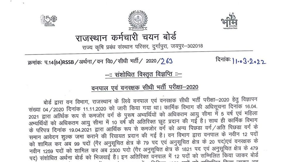 RSMSSB Recruitment 2022: राजस्थान सबोर्डिनेट एंड मिनिस्टीरियल सर्विसेज सेलेक्शन बोर्ड (RSMSSB) ने फॉरेस्टर और फॉरेस्ट गार्ड पदों पर भर्ती के लिए नोटिफिकेशन जारी किया है। सभी इच्छुक और योग्य उम्मीदवार RSMSSB Forester Recruitment 2022 के लिए आधिकारिक वेबसाइट पर 14 मार्च से 29 मार्च 2022 तक ऑनलाइन आवेदन कर सकते हैं। जिन उम्मीदवारों ने इन पदों के लिए पहले ही आवेदन किया था, उन्हें अब दोबारा आवेदन करने की आवश्यकता नहीं होगी।