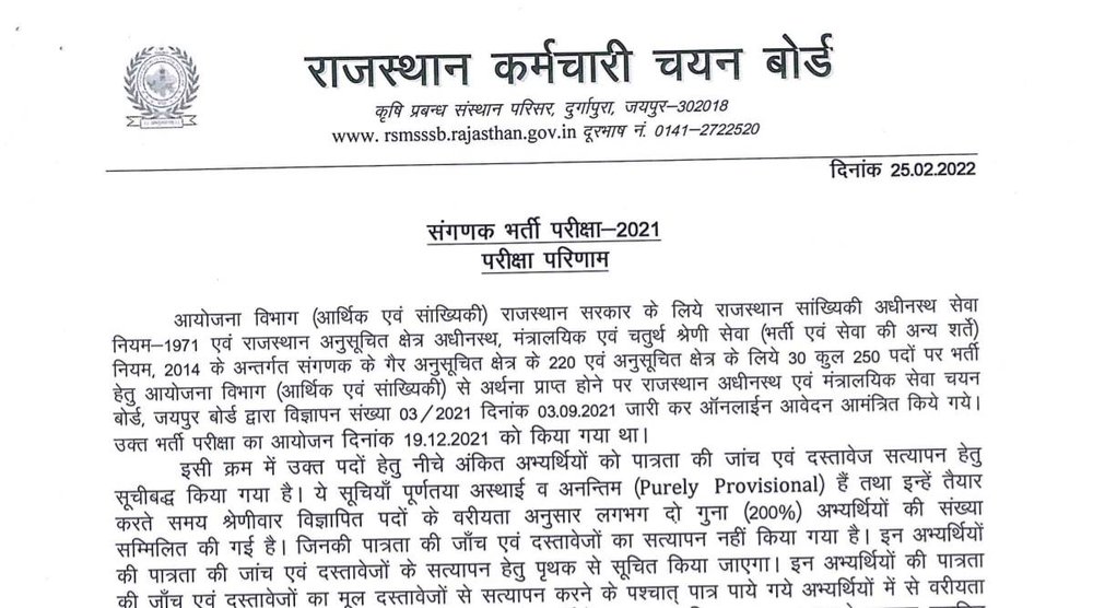 RSMSSB Computor Result 2021: राजस्थान सबोर्डिनेट एंड मिनिस्टीरियल सर्विस सेलेक्शन बोर्ड (RSMSSB) ने कंप्यूटर पदों पर भर्ती के लिए आयोजित परीक्षा का परिणाम जारी कर दिया है, जिन उम्मीदवारों ने इस परीक्षा में भाग लिया था, वह अब बोर्ड की आधिकारिक वेबसाइट rsmssb.rajasthan.gov.in के माध्यम से अपना रिजल्ट डाउनलोड कर सकते हैं।