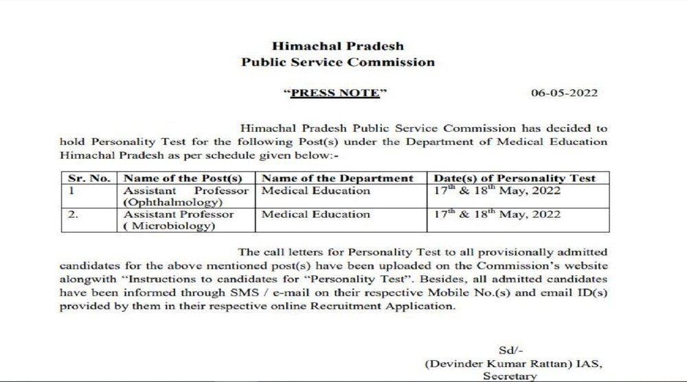 HPPSC Interview Admit Card 2022: हिमाचल प्रदेश लोक सेवा आयोग (HPPSC) ने असिस्टेंट प्रोफेसर इंटरव्यू का एडमिट कार्ड जारी कर दिया है। अभ्यर्थी आधिकारिक वेबसाइट hppsc.hp.gov.in पर जारी एडमिट कार्ड को डाउनलोड कर सकते हैं। इंटरव्यू का आयोजन 17 मई 2022 और 18 मई 2022 को किया जाएगा।