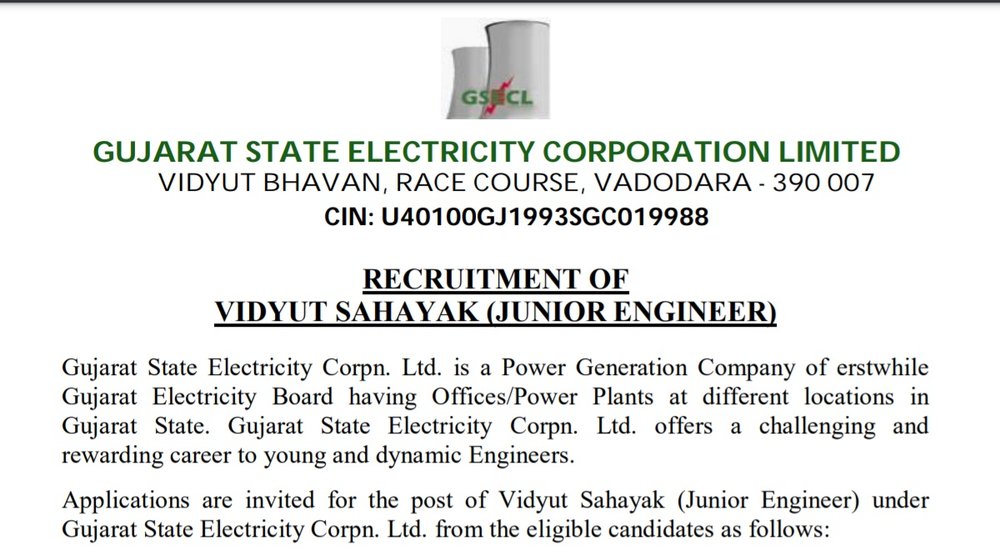 Sarkari Naukri 2021: गुजरात स्टेट इलेक्ट्रिसिटी कॉरपोरेशन लिमिटेड (GSECL) ने जूनियर इंजीनियर या विद्युत सहायक पदों पर भर्ती के लिए नोटिफिकेशन जारी किया है। इच्छुक उम्मीदवार इन पदों पर भर्ती के लिए आधिकारिक वेबसाइट gsecl.in पर 25 अगस्त से ऑनलाइन आवेदन कर सकते हैं। आवेदन करने की आखिरी तारीख 14 सितंबर 2021है।