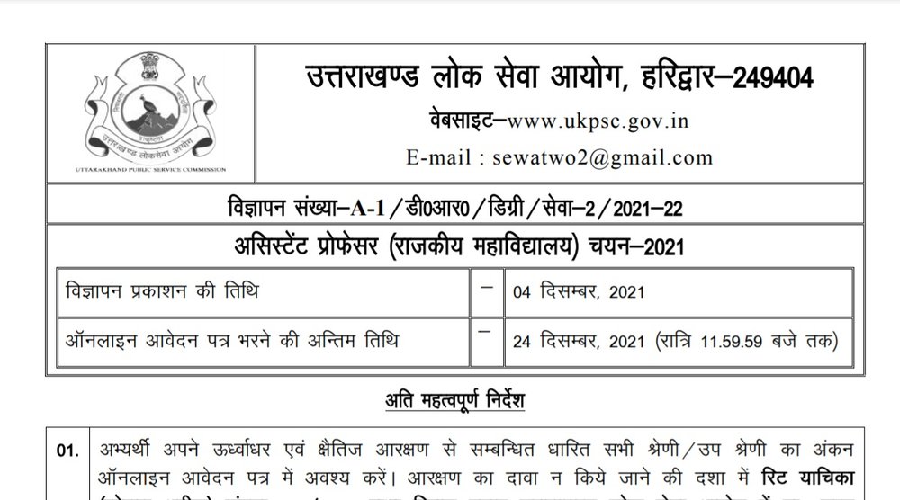 Sarkari Naukri 2021: उत्तराखंड पब्लिक सर्विस कमीशन (UKPSC) ने असिस्टेंट प्रोफेसर के पद पर भर्ती के लिए योग्य उम्मीदवारों से आवेदन मांगे हैं। सभी इच्छुक उम्मीदवार UKPSC Assistant Professor Recruitment 2021 के लिए आधिकारिक वेबसाइट ukpsc.gov.in पर 24 दिसंबर 2021 तक या उससे पहले ऑनलाइन आवेदन कर सकते हैं। इन पदों पर भर्ती के लिए आवेदन प्रक्रिया 4 दिसंबर 2021 से शुरू की जा चुकी है।