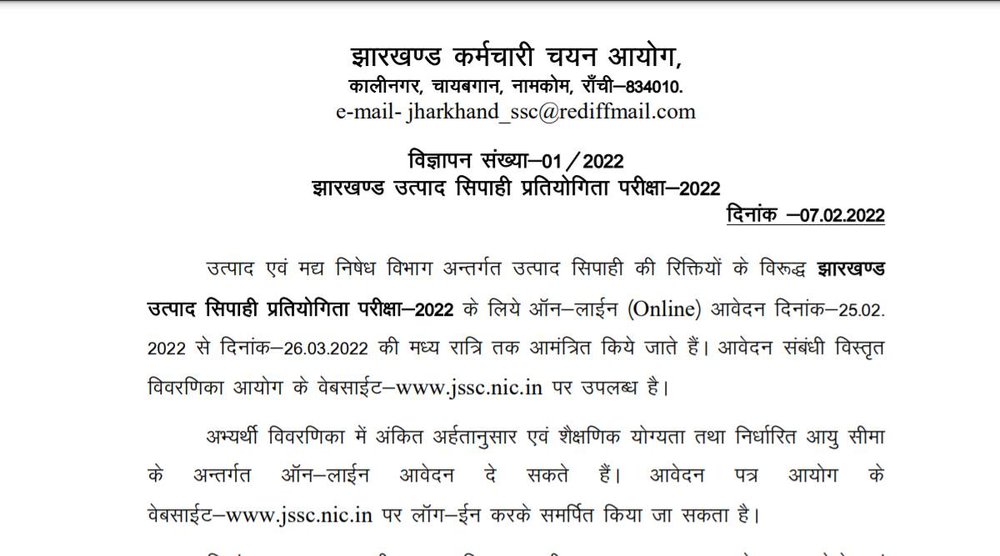 Sarkari Naukri 2022: झारखंड स्टाफ सेलेक्शन कमिशन (JSSC) ने एक्साइज कांस्टेबल पदों पर भर्ती के लिए एक नोटिफिकेशन जारी किया है। सभी इच्छुक और योग्य उम्मीदवार Jharkhand Excise Constable Competitive Exam (JECCE 2022) के लिए आयोग की आधिकारिक वेबसाइट jssc.nic.in पर 25 फरवरी 2022 से ऑनलाइन आवेदन कर सकते हैं। इन पदों पर भर्ती के लिए आवेदन करने की आखिरी तारीख 26 मार्च 2022 निर्धारित की गई है।