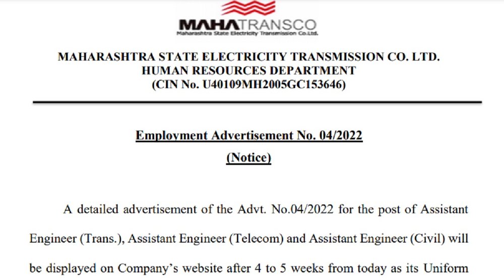 Sarkari Naukri 2022: महाराष्ट्र स्टेट इलेक्ट्रिसिटी ट्रांसमिशन कंपनी लिमिटेड (MAHATRANSCO) में इंजीनियरिंग के उम्मीदवारों के लिए भर्ती निकली है। इसके तहत चीफ इंजीनियर और असिस्टेंट इंजीनियर समेत अन्य पदों पर उम्मीदवारों की भर्ती की जाएगी। इच्छुक उम्मीदवार निर्धारित प्रारूप में 19 अप्रैल 2022 तक या उससे पहले इन पदों के लिए आवेदन कर सकते हैं।