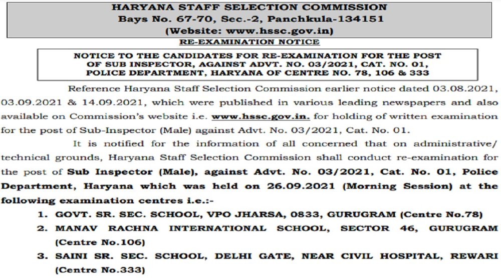 SI Recruitment Exam 2021: हरियाणा सब-इंस्पेक्टर या SI Recruitment 2021 अधिसूचना हरियाणा कर्मचारी चयन आयोग द्वारा 465 पदों के लिए जारी की गई थी। एसआई पद के लिए लिखित परीक्षा का आयोजन HSSC द्वारा 26 सितंबर, 2021 को किया गया था। हालांकि, आयोग ने 3 परीक्षा केंद्रों के लिए परीक्षा फिर से लेने का फैसला किया है। उम्मीदवार इसके बारे में अधिक जानकारी hssc.gov.in पर प्राप्त कर सकते हैं।