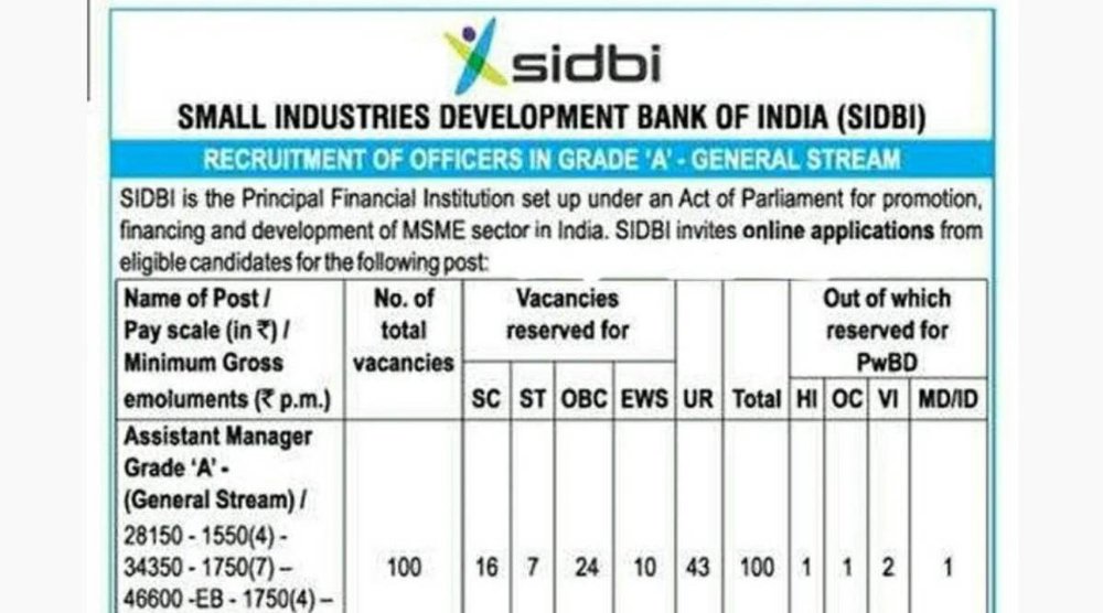 SIDBI Recruitment 2022: स्मॉल इंडस्टरीज डेवलपमेंट बैंक आफ इंडिया (SIDBI) ने असिस्टेंट मैनेजर पदों पर भर्ती के लिए एक शॉर्ट नोटिस जारी किया है। सभी इच्छुक और योग्य उम्मीदवार SIDBI Assistant Manager Recruitment 2022 के लिए अधिकारिक वेबसाइट sidbi.in पर 4 मार्च 2022 से ऑनलाइन आवेदन कर सकते हैं। इन पदों पर भर्ती के लिए आवेदन करने की आखिरी तारीख 24 मार्च 2022 निर्धारित की गई है।