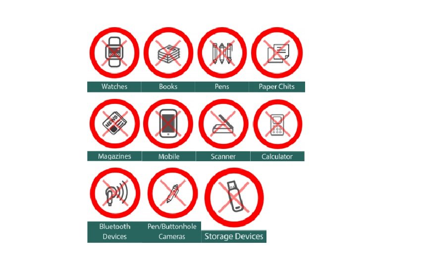 फैशल एसेसरीज पर रोक– उम्मीदवार अपने साथ मेटल की अंगूठी, ब्रैसलेट, इयररिंग, नोज-पिन, चेन, नेकलेस, हेयर पिन, चेन आदि नहीं पहन सकते।