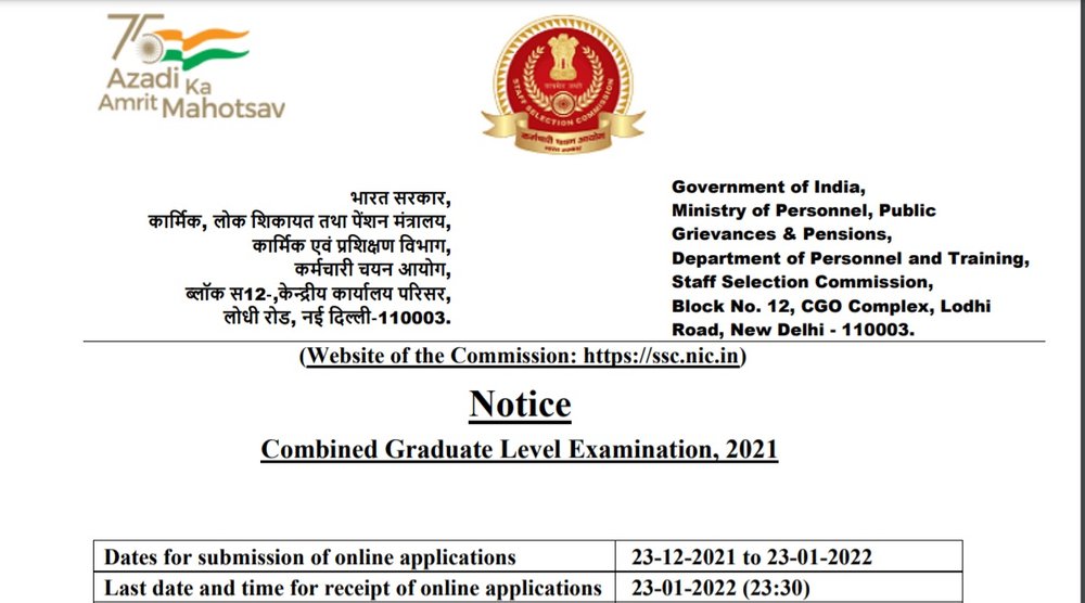 SSC CGL Notification 2021: स्टाफ सेलेक्शन कमिशन (SSC) ने कंबाइंड ग्रैजुएट लेवल (CGL) परीक्षा 2021 का नोटिफिकेशन जारी कर दिया है। सभी इच्छुक और योग्य उम्मीदवार SSC CGL Exam 2021 के लिए आयोग की आधिकारिक वेबसाइट ssc.nic.in पर 23 जनवरी 2022 तक ऑनलाइन आवेदन कर सकते हैं। हालांकि, आवेदन शुल्क जमा करने की आखिरी तारीख 25 जनवरी 2022 निर्धारित की गई है। जानकारी के लिए बता दें कि आवेदन प्रक्रिया 23 दिसंबर 2021 से शुरू की जा चुकी है।