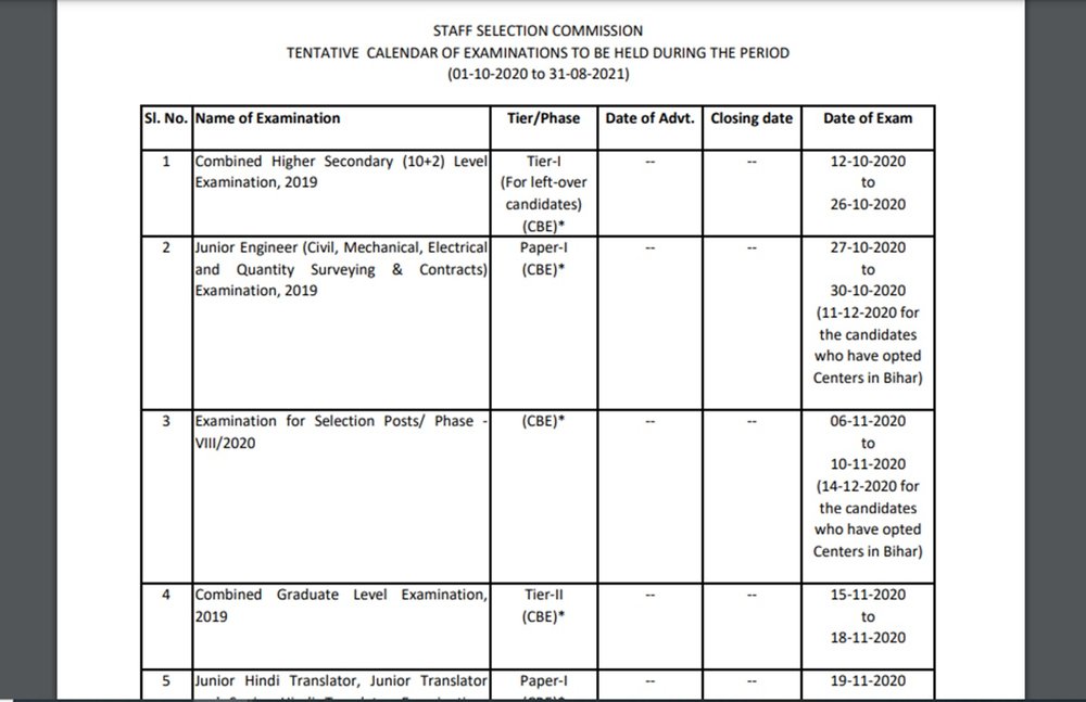 SSC Exam Calendar 2021: स्टाफ सलेक्शन कमीशन ने कोरोना के कारण इस दौरान होने वाले एग्जाम्स को स्थगित कर दिया है। अब इन एग्जाम्स को या तो अगले आदेश तक टाल दिया गया है या फिर नई तारीख दे दी गई हैं। एसएससी ने SSC CGL, SSC CHSL, SSC JE, SSC MTS, SCC CPO, SSC JHT, SSC स्टेनोग्राफर ग्रेड सी एंड डी, एसएससी कांस्टेबल जीडी एवं एग्जीक्यूटिव परीक्षा 2021 के लिए नए अपडेट दिए हैं। एसएससी ने साल 2021 के लिए अपने ऑफिशियल वेबसाइट- ssc.nic.in पर एग्जामिनेशन कैलंडर जारी किया है।