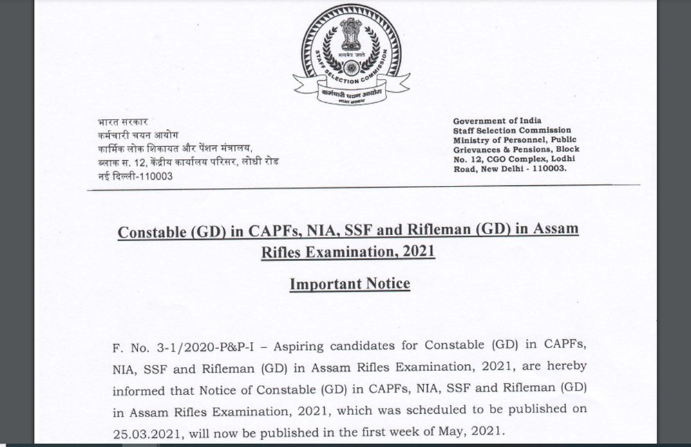 कर्मचारी चयन आयोग (SSC) इस सप्ताह में SSC GD भर्ती 2021 के लिए नोटिस जारी करने जा रहा है, मई 2021 के पहले सप्ताह में ssc.nic.in पर नोटिस जारी होगा। एसएससी द्वारा जीडी कॉन्सबटेबल परीक्षा के माध्यम से केंद्रीय सशस्त्र पुलिस बलों (सीएपीएफ), राष्ट्रीय जांच एजेंसी (एनआईए), सचिवालय सुरक्षा बल (एसएसएफ) में कॉन्सटेबल (जनरल ड्यूटी) और असम राइफल्स में राइफलमैन (जनरल ड्यूटी) के पदों पर भर्ती की जाएगी। आयोग द्वारा हाल ही में 9 अप्रैल को जारी अपडेट के अनुसार जीडी कॉन्सटेबल परीक्षा 2021 की अधिसूचना, जो कि 25 मार्च को जारी होनी थी, अब मई 2021 के पहले सप्ताह में जारी की जाएगी।