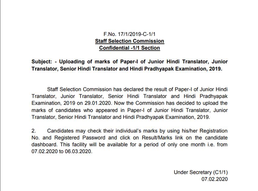 चरण 4: इस पेज पर, ‘Uploading of marks of Paper-I of Junior Hindi Translator, Junior Translator, Senior Hindi Translator and Hindi Pradhyapak Examination, 2019’ के सामने रिजल्ट का लिंक खुल जाएगा।