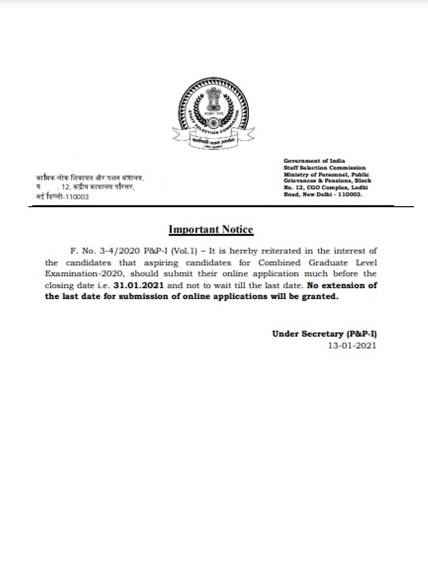 SSC CGL 2020 Recruitment important notice: कर्मचारी चयन आयोग (SSC) ने कंबाइंड ग्रेजुएट लेवल (CGL) परीक्षा 2020 से संबंधित जरूरी नोटिस जारी किया है। एसएससी सीजीएल की भर्ती परीक्षा के लिए इच्छुक उम्मीदवारों को सूचित करते हुए आयोग ने नोटिस जारी किया है। नोटिस में आयोग ने सलाह देते हुए बताया, कि जो उम्मीदवार SSC CGL 2020 Exam के लिए आवेदन करने चाहते हैं और अभी तक आवेदन नहीं किया है वे अंतिम तिथि का इंतजार न करें। आयोग ने ऐसे उम्मीदवारों को अंतिम तिथि यानी 31 जनवरी 2021 से पहले ऑनलाइन आवेदन करने की सलाह दी है।