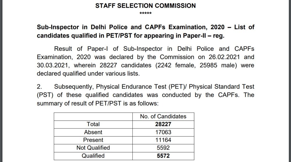 स्टेप 3: फिर यहां ‘Sub – Inspector in Delhi Police and CAPFs Examination, 2020 – List of candidates qualified in PET / PST for appearing in Paper -II’ के लिंक पर क्लिक करें।