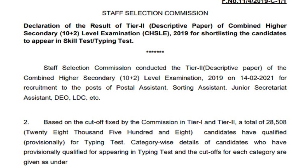 वे उम्मीदवार जिन्होंने SSC CHSL 2018 टियर II परीक्षा उत्तीर्ण की थी, वे टाइपिंग टेस्ट के लिए उपस्थित होने के पात्र थे। टियर II परीक्षा का परिणाम 25 फरवरी, 2020 को घोषित किया गया था। 30822 उम्मीदवार एलडीसी / जेएसए, पीए / एसए के लिए टाइपिंग टेस्ट में उपस्थित होने के लिए योग्य थे।