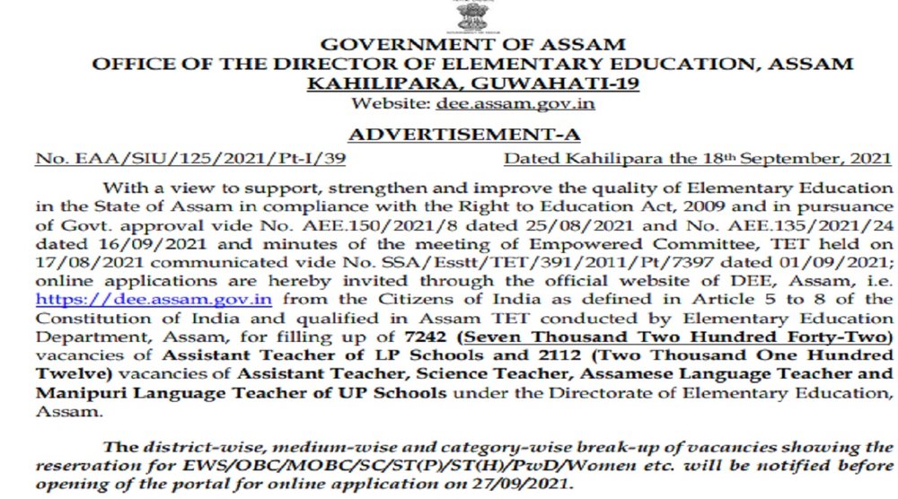 Teachers Recruitment 2021: प्रारंभिक शिक्षा निदेशक, असम या डीईई असम ने शिक्षक भर्ती के लिए आधिकारिक नोटिफिकेशन जारी की थी। ऑफिशियल नोटिफिकेशन के अनुसार 9,354 शिक्षण पदों को भरने के लिए भर्ती प्रक्रिया 27 सितंबर से शुरू होगी, आवेदन पत्र डीईई असम की आधिकारिक वेबसाइट dee.assam.gov.in पर उपलब्ध होंगे।