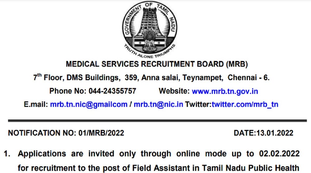 TN MRB recruitment 2022: मेडिकल सर्विसेज रिक्रूटमेंट बोर्ड (MRB), तमिलनाडु ने पब्लिक हेल्थ सबऑर्डिनेट सर्विस में फील्ड असिस्टेंट के पदों पर भर्ती के लिए उम्मीदवारों से ऑनलाइन आवेदन आमंत्रित किए हैं। योग्य उम्मीदवार, टीएन एमआरबी की आधिकारिक वेबसाइट mrb.tn.gov.in के माध्यम से ऑनलाइन आवेदन पत्र जमा कर सकते हैं।