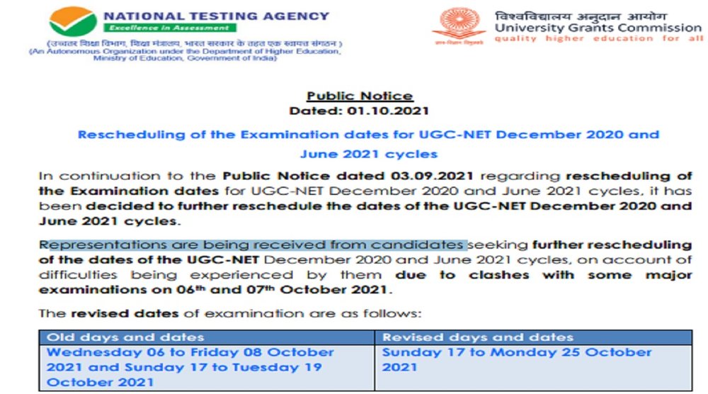 ऑफिशियल नोटिफिकेशन के अनुसार 06 और 07 अक्टूबर 2021 को कुछ प्रमुख परीक्षाएं होने के कारण यूजीसी-नेट दिसंबर 2020 और जून 2021 साइकिल्स की तारीखों में बदलाव किया है। UGC-NET 2021 परीक्षा पहले 6 से 8 अक्टूबर और 17 से 19 अक्टूबर, 2021 तक आयोजित होने वाली थी। उम्मीदवारों को सलाह दी जाती है कि वे लेटेस्ट अपडेट के लिए एनटीए की आधिकारिक वेबसाइटों ugcnet.nta.nic.in और nta.ac.in को चेक करते रहें।