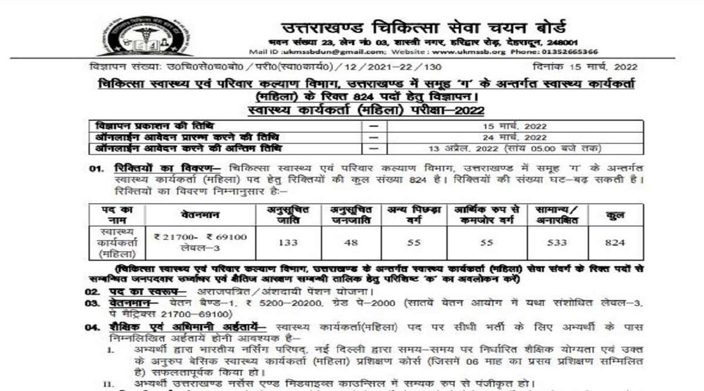 UKMSSB Recruitment 2022: उत्तराखंड चिकित्सा सेवा चयन बोर्ड ने स्वास्थ्य कार्यकर्ता के पदों पर भर्तियों के लिए विज्ञापन जारी किया है। इन पदों के लिए 24 मार्च 2022 से आवेदन की प्रक्रिया जारी है। अभ्यर्थी आधिकारिक वेबसाइट ukmssb.org के जरिए 13 अप्रैल 2022 तक आवेदन कर सकते हैं।