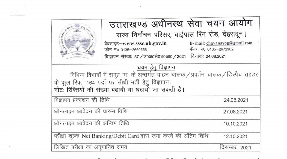 UKSSSC Recruitment 2021: उत्तराखंड सबोर्डिनेट सर्विस सेलेक्शन कमीशन (UKSSSC) ने ड्राइवर, इंफोर्समेंट ड्राइवर और डिस्पैच राइडर पदों पर भर्ती के लिए नोटिफिकेशन जारी किया है। इच्छुक उम्मीदवार इन पदों पर भर्ती के लिए कमीशन की आधिकारिक वेबसाइट sssc.uk.gov.in के माध्यम से 27 अगस्त से आवेदन कर सकेंगे। आवेदन करने की आखिरी तारीख 10 अक्टूबर 2021 है। हालांकि, फीस जमा करने की आखिरी तारीख 12 अक्टूबर 2021 है।