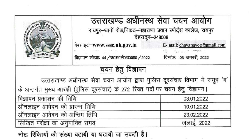 UKSSSC Recruitment 2022: उत्तराखंड पुलिस (Uttarakhand Police) में भर्ती होने की चाह रखने वाले युवाओं के लिए बड़ा मौका है। उत्तराखंड में सबोर्डिनेट सर्विस सिलेक्शन कमीशन ने हेड कॉन्स्टेबल के कई पदों पर भर्ती निकाली है। रिक्त पदों की संख्या 272 है।