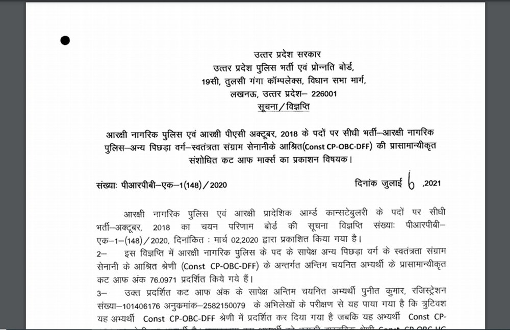 उत्तर प्रदेश पुलिस भर्ती एवं प्रोन्नति बोर्ड ने अपनी आधिकारिक वेबसाइट uppbpb.gov.in पर इसके संबंध में नोटिफिकेशन जारी किया है। नोटिस में कहा है कि इस भर्ती का रिजल्ट 2 मार्च 2020 को जारी किया गया था। इसमें कांस्टेबल सीपी-ओबीसी-डीएफएफ कैटेगरी के अंतर्गत अंतिम चयनित अभ्यर्थी के नार्मलाइज्ड कटऑफ अंक 76.0971 प्रदर्शित किए गए हैं, लेकिन अंतिम चयनित अभ्यर्थी पुनीत कुमार के अभिलेखों से यह पाया गया है कि गलती से यह अभ्यर्थी सीपी-ओबीसी-डीएफएफ कैटेगरी में प्रदर्शित कर दिया गया है जबकि यह अभ्यर्थी सीपी-ओबीसी-एचजी कैटेगरी का है। ऐसे में उसकी असल कैटेगरी में उसे वापस डाला जाता है।