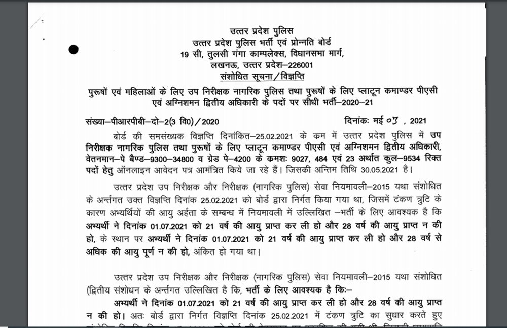 यूपी पुलिस में 9534 पदों पर भर्ती की प्रक्रिया चल रही है। इस भर्ती प्रक्रिया से यूपी पुलिस में सब इंस्पेक्टर, पीएसी में प्लाटून कमांडर व फायर सर्विस में अग्निशमन अधिकारी द्वितीय के पद भरे जाने हैं। इसके लिए नोटिफिकेशन 25 फरवरी को जारी किया गया था। बोर्ड के अपर सचिव भर्ती के मुताबिक 25 फरवरी को जारी होने वाले नोटिफिकेशन में टाइपिंग की गलती थी। जिसे बाद में सुधारकर दोबारा नोटिस जारी किया गया। नया नोटिस 7 अप्रैल को जारी किया गया था। अब भर्ती 7 अप्रैल के नोटिस के मुताबिक चल रही हैं। 25 फरवरी के नोटिस में जो गलती थी वो आयु सीमा में थी।