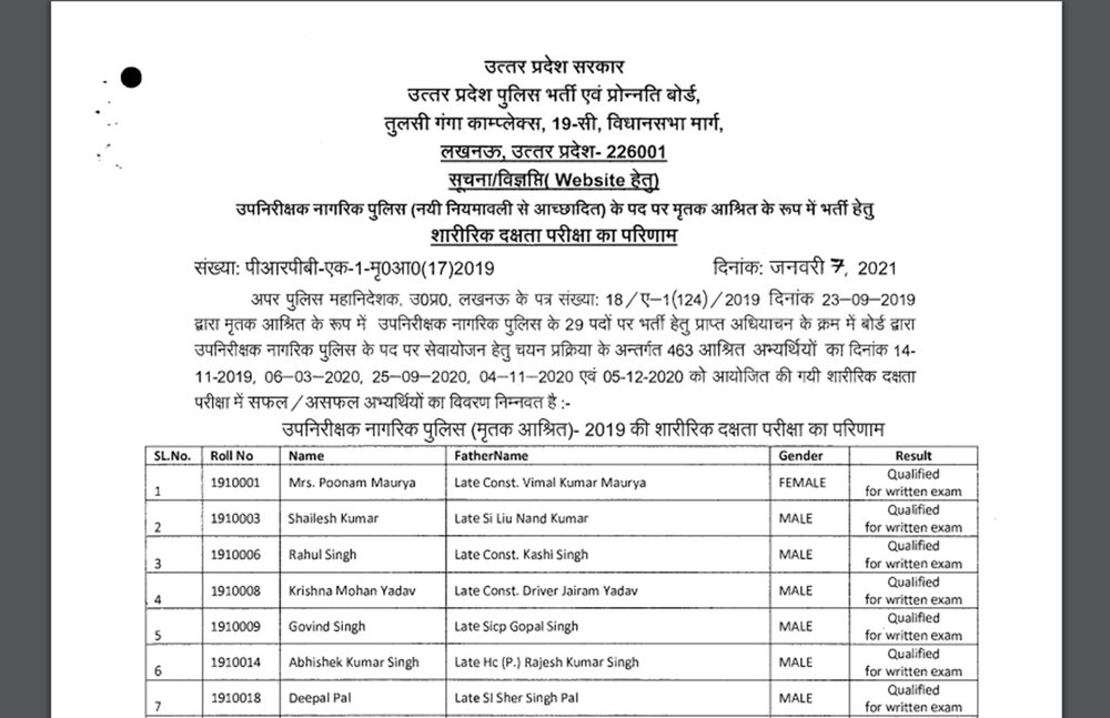 यूपी पुलिस में सब इंस्पेक्टर के लिए भर्ती परीक्षा कराई गई थी। इस भर्ती प्रक्रिया से मृतक आश्रित कोटे के तहत 29 पद भरे जाने हैं। सबसे पहले इसमें फिजिकल टेस्ट कराया गया था। फिजिकल टेस्ट में पास होने वालों को लिखित परीक्षा के लिए बुलाया जाएगा। लिखित परीक्षा के लिए 293 कैंडिडेट्स को सलेक्ट किया गया है। शारीरिक परीक्षा एक साल से ज्यादा समय से चल रही है। परीक्षा 14 सितंबर 2019, 6 मार्च 2020, 25 सितंबर 2020, 4 नवंबर 2020 और 5 दिसंबर 2020 को आयोजित कराई गई थी। यह परीक्षाएं यूपी पुलिस भर्ती की नई नियमावली के मुताबिक हो रही हैं।