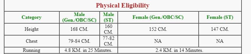 पुरुष: ऊंचाई- 168 सेमी (एससी-एसटी के लिए 160 सेमी)