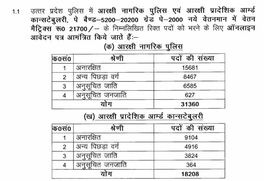 यूपी पुलिस ने 49 हजार से ज्यादा पदों के लिए भर्तियां निकाली हैं। इनमें सबसे ज्यादा पद सिटिजन पुलिस के लिए हैं। सिटिजन पुलिस के लिए 31 हजार से ज्यादा पदों के लिए भर्तियां निकाली गई हैं। इसके अलावा 18 हजार से ज्यादा पदें सशस्त्र पुलिस बल के लिए हैं।