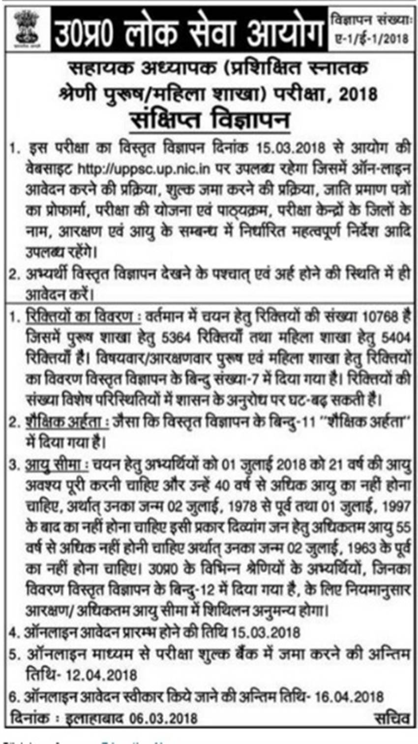 UPPSC Recruitment 2018: उत्तर प्रदेश लोक सेवा आयोग (UPPSC) ने सहायक अध्यापक परीक्षा 2018 (प्रशिक्षित स्नातक श्रेणी पुरुष/महिला शाखा) का संक्षिप्त विज्ञापन जारी कर दिया है। आयोग सहायक अध्यापक के रिक्त पड़े 10768 पदों पर नियुक्ति इस परीक्षा के जरिए करेगा। परीक्षा का विस्तृत विज्ञापन 15 मार्च 2018 से उत्तर प्रदेश लोक सेवा आयोग की आधिकारिक वेबसाइट पर उपलब्ध होगा। इसमें ऑनलाइन आवेदन करने की प्रक्रिया और नियुक्ति से संबंधित सभी महत्वपूर्ण जानकारी दी जाएगी। ऑनलाइन आवेदन प्रक्रिया 15 मार्च 2018 से शुरू होगी 16 अप्रैल 2018 तक चलेगी। चलिए और विस्तार से जानते हैं इन भर्तियों के बारे में। 10768 पदों में से पुरुष सहायक अध्यापक के 5364 और महिला सहायक अध्यापक के 5404 पदों पर भर्ती होनी है। चयनित अभ्यर्थियों को अधिकतम 34800 रुपए का वेतन मिल सकता है।