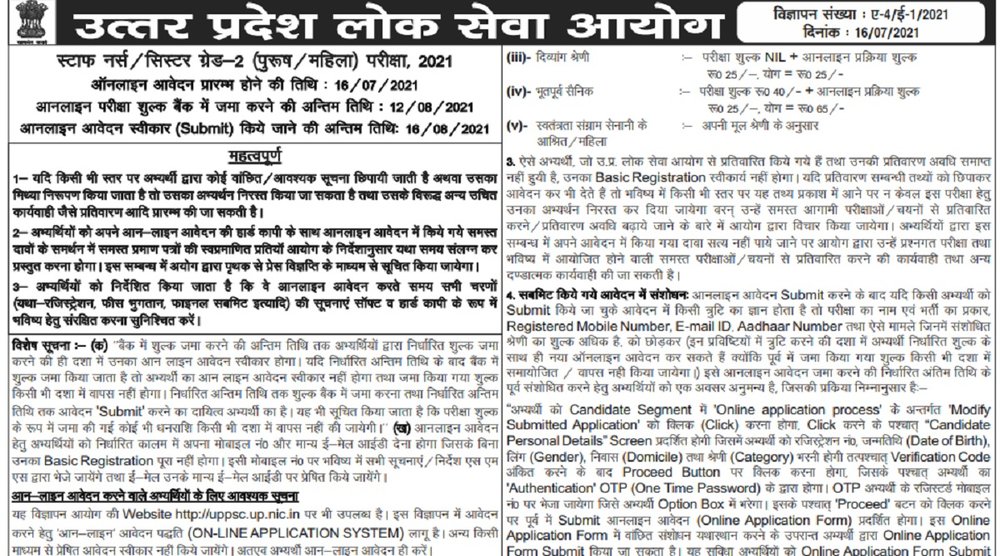 ऑनलाइन आवेदन तभी स्वीकार किए जाएंगे जब शुल्क जमा करने की निर्धारित अंतिम तिथि अर्थात 31 अगस्त तक बैंक में निर्धारित शुल्क जमा किया जाएगा। भर्ती अभियान का उद्देश्य स्टाफ नर्स / सिस्टर ग्रेड -2 की कुल 3012 रिक्तियों को भरना है, जिनमें से 341 पद पुरुष उम्मीदवारों के लिए और 2671 महिला उम्मीदवारों के लिए हैं। उत्तर प्रदेश लोक सेवा आयोग (UPPSC) के स्टाफ नर्स / सिस्टर ग्रेड -2 (पुरुष / महिला) के पदों पर आवेदन करने के लिए उम्मीदवारों की न्यूनतम आयु 21 वर्ष एवं अधिकतम आयु 40 वर्ष होनी चाहिए। आरक्षित वर्ग के उम्मीदवारों को नियमानुसार छूट प्रदान की जाएगी।
