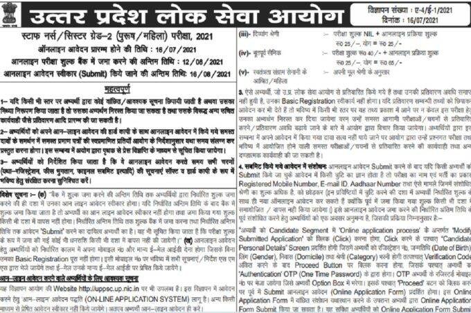UPPSC Recruitment 2021: उत्तर प्रदेश लोक सेवा आयोग (UPPSC) ने स्टाफ नर्स / सिस्टर ग्रेड -2 के पद पर भर्ती के लिए एक अधिसूचना जारी की है। योग्य और इच्छुक पुरुष और महिला उम्मीदवार 16 जुलाई 2021 से UPPSC Recruitment 2021 के लिए ऑनलाइन आवेदन कर सकते हैं। यूपीपीएससी स्टाफ नर्स आवेदन 16 अगस्त 2021 तक UPPSC की वेबसाइट uppsc.up.nic.in पर उपलब्ध है। हालांकि फीस जमा करने की आखिरी तारीख 12 अगस्त 2021 है। कुल 3012 रिक्तियां उपलब्ध हैं, जिनमें से 2671 महिला उम्मीदवारों के लिए और 341 पुरुष उम्मीदवारों के लिए हैं।
