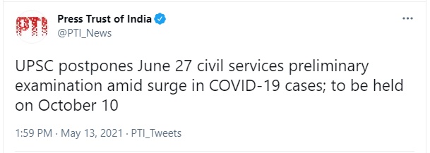 UPSC Civil Services Prelims Exam 2021: संघ लोक सेवा आयोग (UPSC) ने गुरुवार 13 मई को COVID-19 मामलों में उछाल के बीच 27 जून की सिविल सेवा प्रारंभिक परीक्षा को स्थगित करने के अपने निर्णय की घोषणा की। अब यह परीक्षा 10 अक्टूबर को होगी। संघ लोक सेवा आयोग 27 जून 2021 को सिविल सेवा में IAS / IPS / IFS अधिकारियों की भर्ती के लिए UPSC IAS प्रारंभिक 2021 परीक्षा आयोजित करने वाला था। UPSC IAS सिविल सेवा भारतीय प्रशासनिक सेवा (IAS), भारतीय पुलिस सेवा (IPS) और भारतीय विदेश सेवा (IFS) में अधिकारी के रूप में नौकरी पाने के इच्छुक उम्मीदवारों के लिए है।