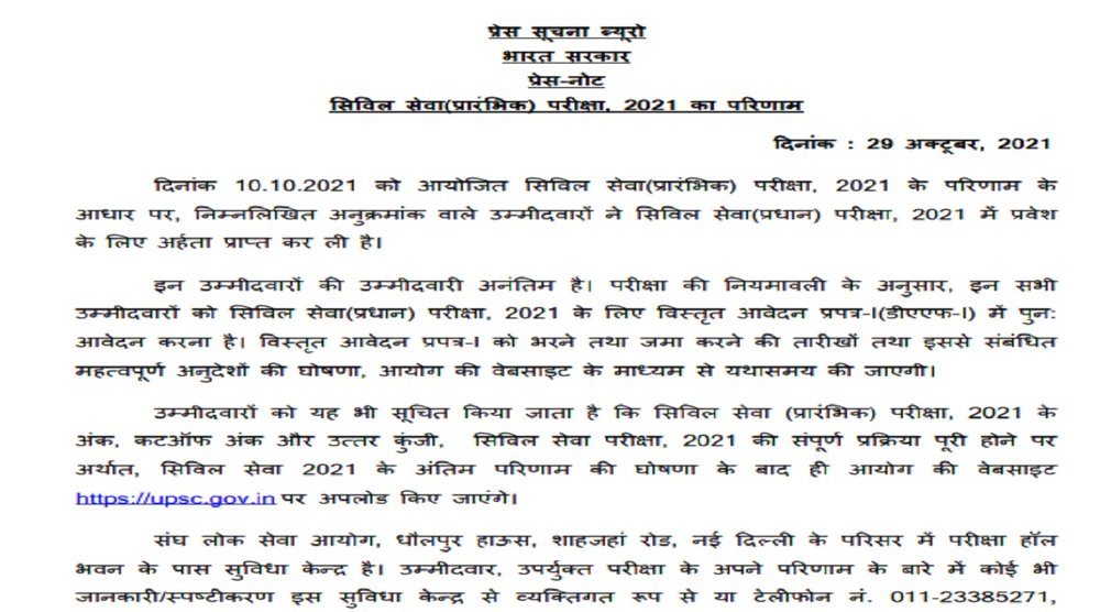 UPSC CSE 2021 Result: संघ लोक सेवा आयोग (UPSC) ने 10 अक्टूबर, 2021 को आयोजित सिविल सेवा (प्रारंभिक) परीक्षा, का परिणाम जारी कर दिया है। आयोग ने उन उम्मीदवारों की सूची जारी की है, जिन्होंने सिविल सेवा मेन परीक्षा, 2021 में प्रवेश के लिए सफलता प्राप्त की है। UPSC prelims results के रिजल्ट आधिकारिक वेबसाइट upsc.gov.in पर उपलब्ध हैं।