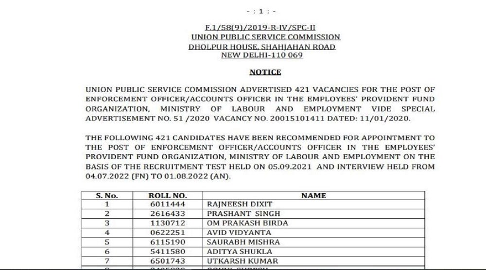 UPSC EPFO Final Result 2022 Declared: संघ लोक सेवा आयोग (UPSC) ने कर्मचारी भविष्य निधि संगठन, श्रम और रोजगार मंत्रालय में प्रवर्तन अधिकारी / लेखा अधिकारी के पद के लिए फाइनल रिजल्ट घोषित कर दिया है। अभ्यर्थी आधिकारिक वेबसाइट upsc.gov.in के जरिए अपने नतीजे चेक कर सकते हैं।