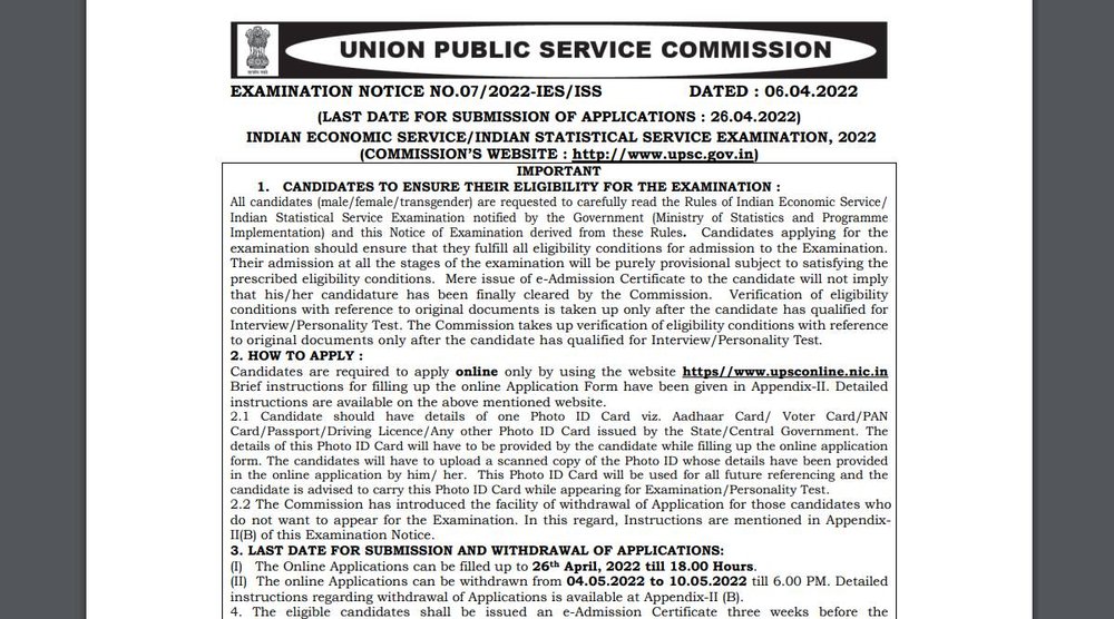 UPSC Notification 2022: संघ लोक सेवा आयोग (UPSC) ने इंडियन इकोनामिक सर्विस (IES) और इंडियन स्टैटिसटिकल सर्विस (ISS) एग्जाम 2022 के लिए नोटिफिकेशन जारी कर दिया है। सभी योग्य उम्मीदवार UPSC IES ISS Exam 2022 के लिए आयोग की आधिकारिक वेबसाइट upsc.gov.in पर 26 अप्रैल 2022 तक या उससे पहले ऑनलाइन आवेदन कर सकते हैं।
